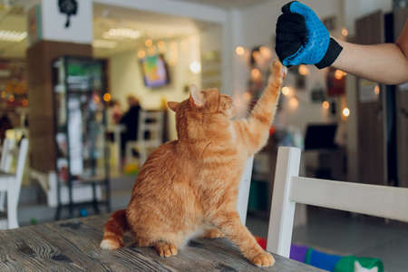 Man grooming cat with special gloves. Pet care.