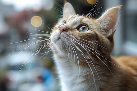 a cat gazes out the window, captured with an anamorphic lens flare effect. this photorealistic portrait showcases the cat's elegant and emotive face in stunning 32k uhd resolution. the light amber and emerald tones add a touch of warmth and depth to this macro photograph, highlighting the cat's striped fur pattern. ai generated