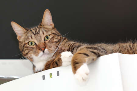 Striped domestic cat observes from the fridge