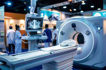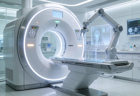A futuristic medical imaging device is illuminated in a dimly lit hospital, showing advanced technology.