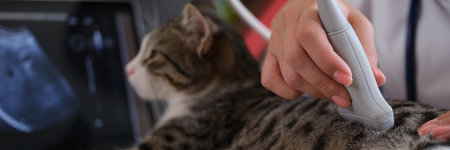 Manual veterinarian conducts an ultrasound examination of cat