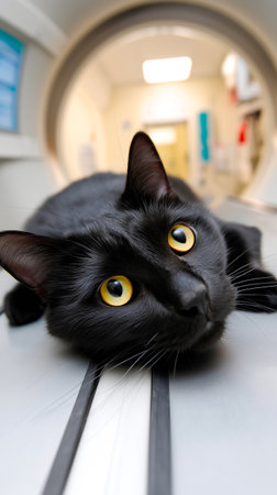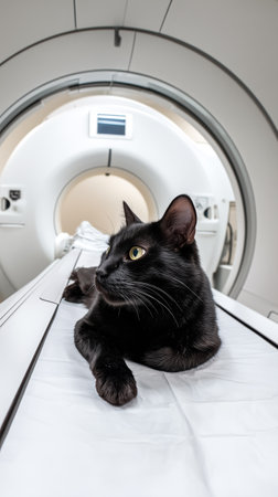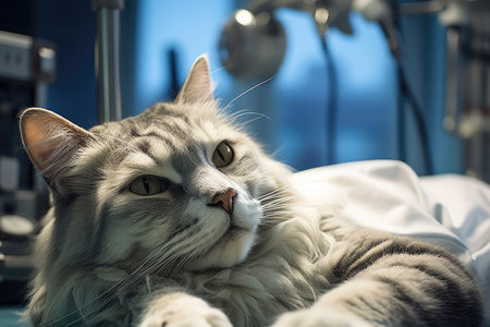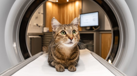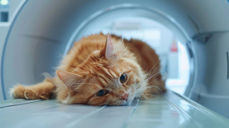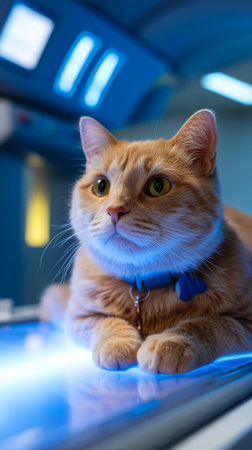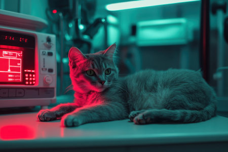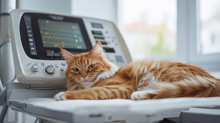 Relaxed cat lying on ultrasound machine in veterinary clinic. concept of pet healthcare, veterinary technology, feline health, animal care.