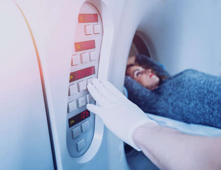 City of Gomel, Belarus May 31, 2017.Main medical hospital.An unknown woman is made magneto-resonant therapy.Medical examination of the body