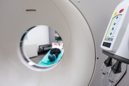 Patient being scanned and diagnosed on a CT computed tomography scanner in a hospital. Modern medical equipment, medicine and health care concept.