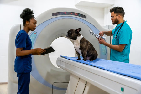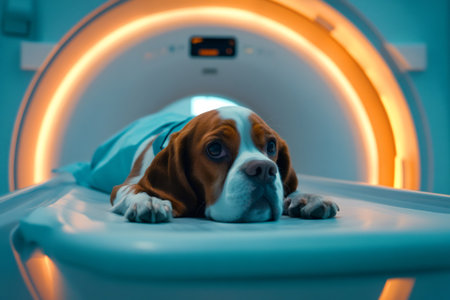 Cute dog sitting on the MRI and waiting for the procedure