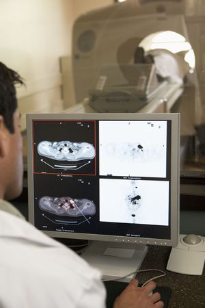 Doctor Monitoring Patient Having Computerized Axial Tomography (CAT) Scan