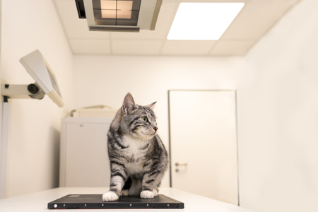 Veterinarians make x-ray sick cat on a table in a clinic.