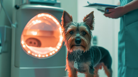 Yorkshire Terrier Dog in Veterinary Clinic Near Modern Pet Incubator. Concept of Animal Healthcare, Veterinary Technology, Pet Treatment, Professional Veterinary Care, Dog Wellness, pet recovery.