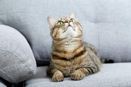 tabby domestic shorthair cat relaxing on gray couch looking up