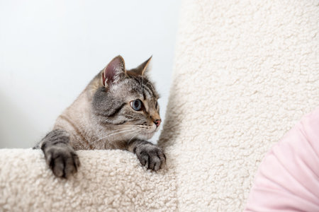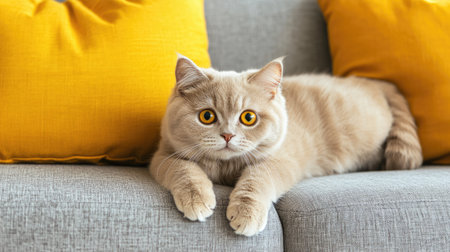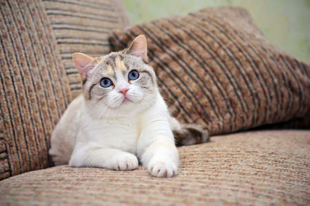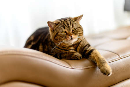Domestic scottish straight brown tabby cat with big yellow eyes is resting on the sofa in the room. Elegant cat close up.