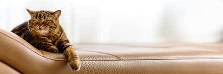 Happy British cat lying relaxed and sleepy on couch at home. British shorthair breed
