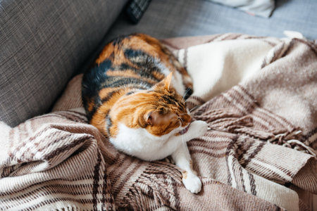 Calico cat resting on a cozy blanket on a couch, symbolizing home, love, fun, and warmth in a comfortable and inviting domestic setting