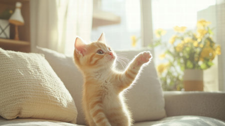 Playful kitten explores a sunny living room, reaching out with its paw while surrounded by warmth and vibrant flowers.