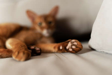 An Abyssinian cat lies on a couch with its paw outstretched towards the camera