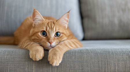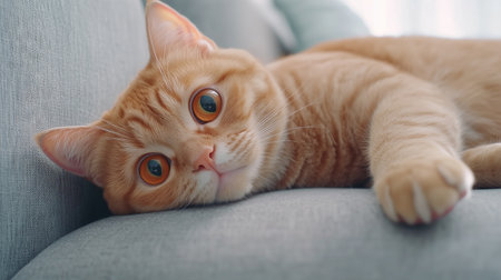 Cute red cat lying on gray couch at home