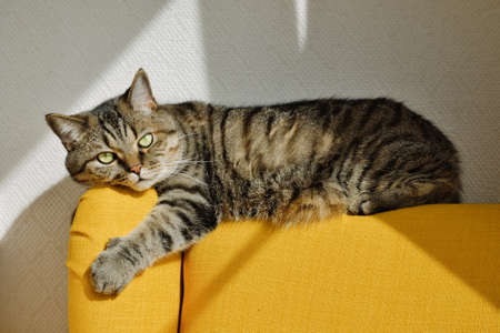Tabby gray cat lies on back of soft yellow armchair. Resting cat.