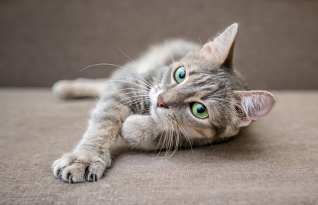 The gray cat with green eyes lies on a sofa. Gray cat with green eyes. Gray cat. Striped not purebred kitten. Small predator. Small cat.