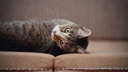 Portrait of the striped domestic cat lying on a sofa.