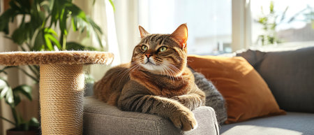 Cat on a modern cat tree in a cozy, sunlit living room