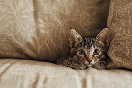 A playful kitten with striking green eyes rests comfortably on a plush sofa peeking out from behind decorative cushions. The warm sunlight filters through the room casting a gentle glow on the furry creature