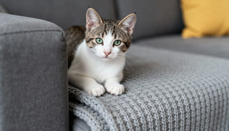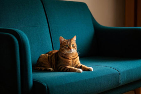 Tabby cat sitting on a couch with a curious gaze at home