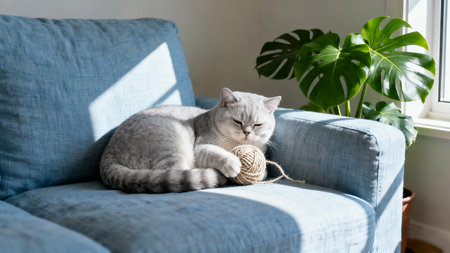 British Shorthair cat with ball of thread on sofa at home