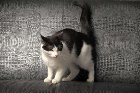 Cute black and white cat lying on a sofa in the living room