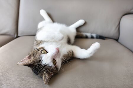 funny domestic cat lay on a sofa at home