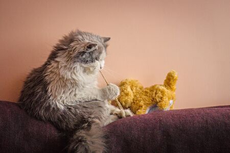 Beautiful domestic cat plays with a toy. Long haired cat with toy. Kitten playing with toy