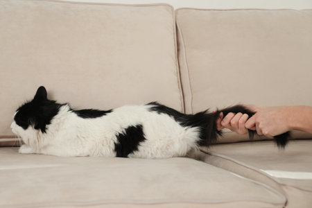 Woman beating cat at home, closeup of hands. Domestic violence against pets