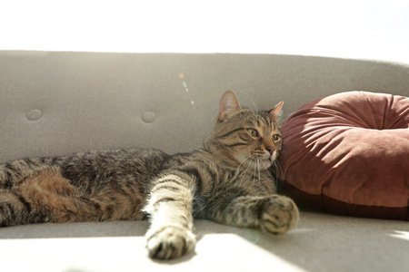 Cute striped cat lying on cozy sofa indoors