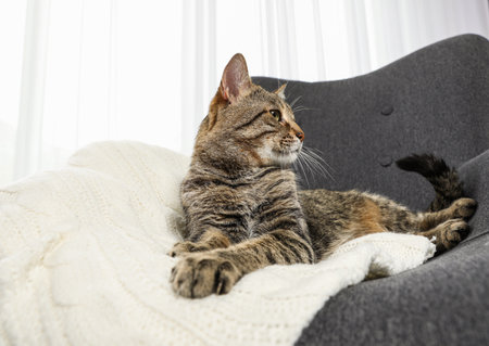 Cute tabby cat lying in armchair indoors. friendly pet