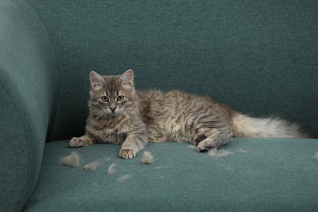 Pet shedding. Cute cat with lost hair on sofa indoors