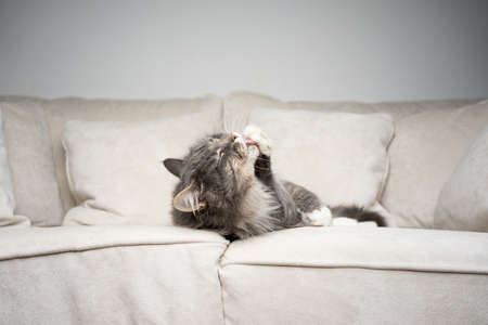 cute gray white maine coon cat lying on couch grooming fur licking paw