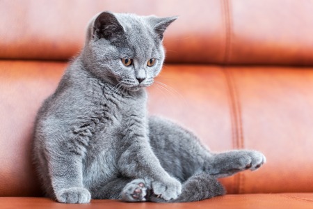 Young cute cat resting on leather sofa. The British Shorthair pedigreed kitten with blue gray fur
