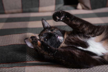 A beautiful spotted domestic cat lies on the bed. She raised her paws up and plays.