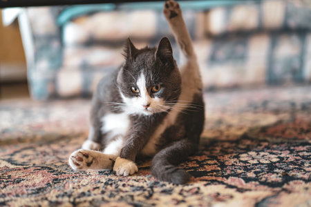 Gray and white domestic cat is grooming on an ornate carpet, raising its back leg while looking intently forward, demonstrating flexibility and natural feline hygiene