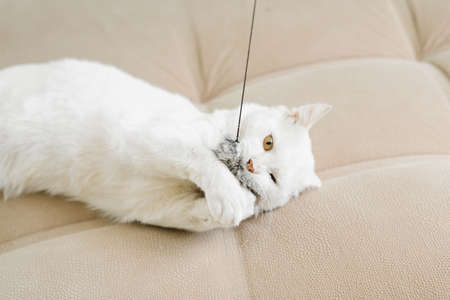 White cat playing with a toy while lying on the couch