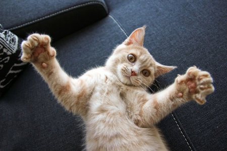 Cute little ginger kitten lays on the sofa in funny pose