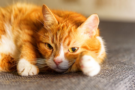 Cute ginger cat lying on the sofa, close-up.