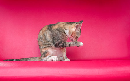 Portrait A cat with a blend of brown yellow and black color, licking its paw. Sitting on a red chair.