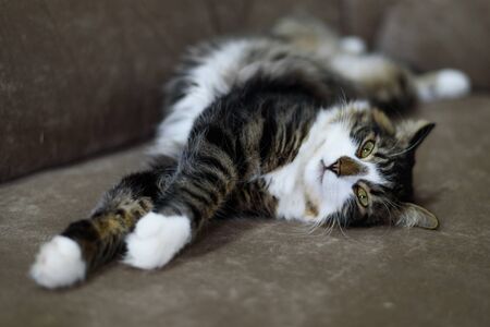 Siberian Cat lying on the sofa. Fluffy Cat. Hypoallergenic Cat. Cat with yellow eyes.