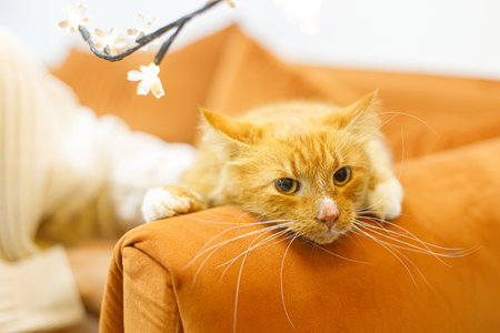 Ginger cat is laying on sofa and washing its face with paws, calm and happy, perfect pet companion
