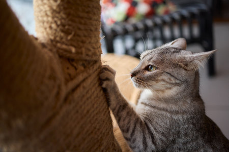 Tabby cat scratches sofa with his claws. Interior destruction by pets. Kitten play. Lifestyle home daily life with pets in living room