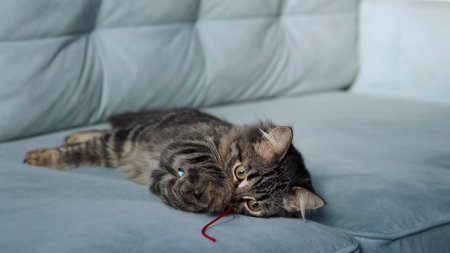 tabby young kitten grabs in his paws a toy and trying to scratch it in day light. funny cat is playing on the sofa with toy. pet is caught mouse. Comfort and cosiness in the house