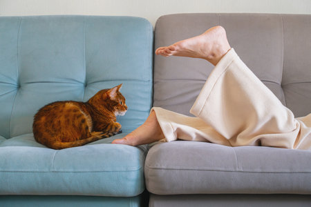 Bengal Cat Lies Comfortably on Sofa Next to Females Legs. Home Relaxation and Cozy Leisure Time with Pet.