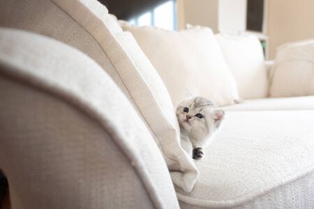 Close up of cute kitten walk and playing on the sofa in home.