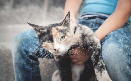 Cat on the lap of a teenage girl. Pet Protection The problem of stray cats in the city.