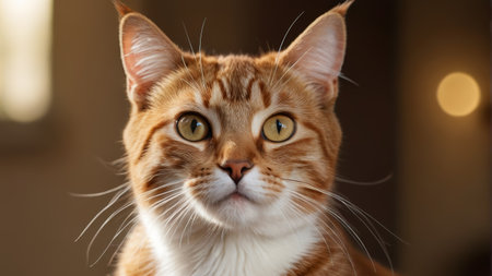 Close-up portrait of an orange tabby cat with striking yellow eyes, gazing attentively. Soft lighting highlights the cat's fur texture and facial features.