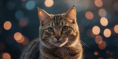 Bokeh overlay texture with soft lights highlighting a cats gaze in an atmospheric setting